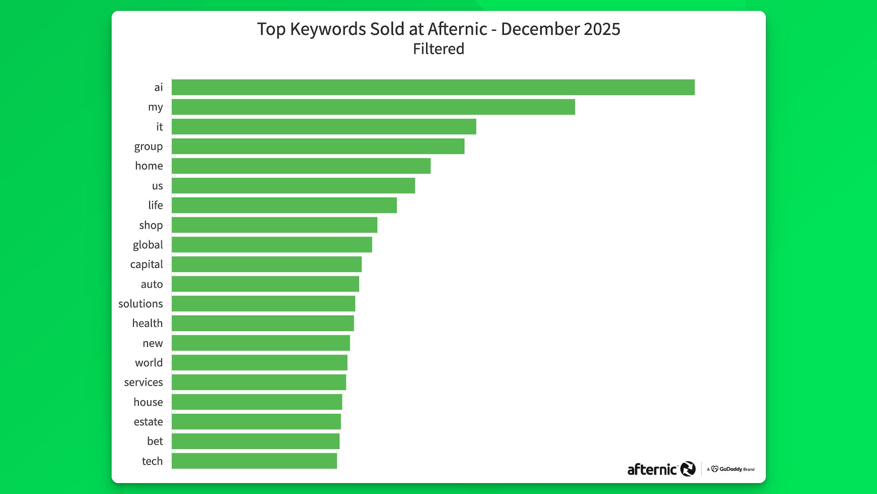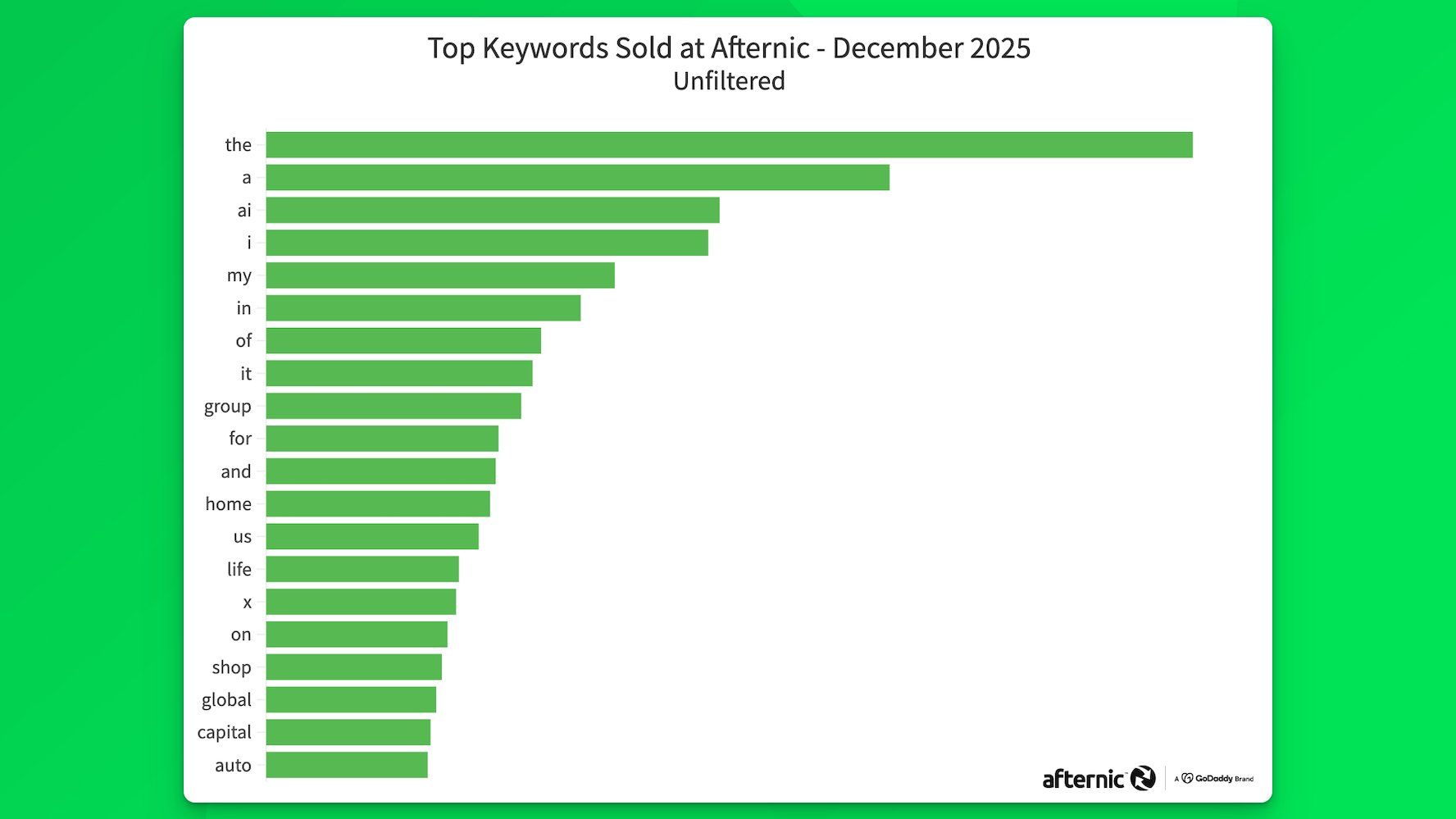 Here’s a look at December’s unfiltered keywords in domain sales at Afternic. “The” leads the list once again, followed by “a” and AI.